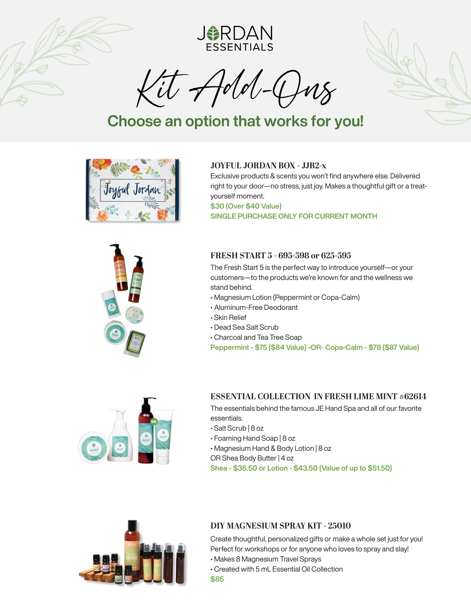 Additionally, you can customize your start as a Jordan Essentials Consultant with our stylized "Journeys” and Add-On Collections: the Health & Wellness Box and Face Care Collections are just a few examples. Each of these add-ons focuses on specific areas to help you build and personalize your business.